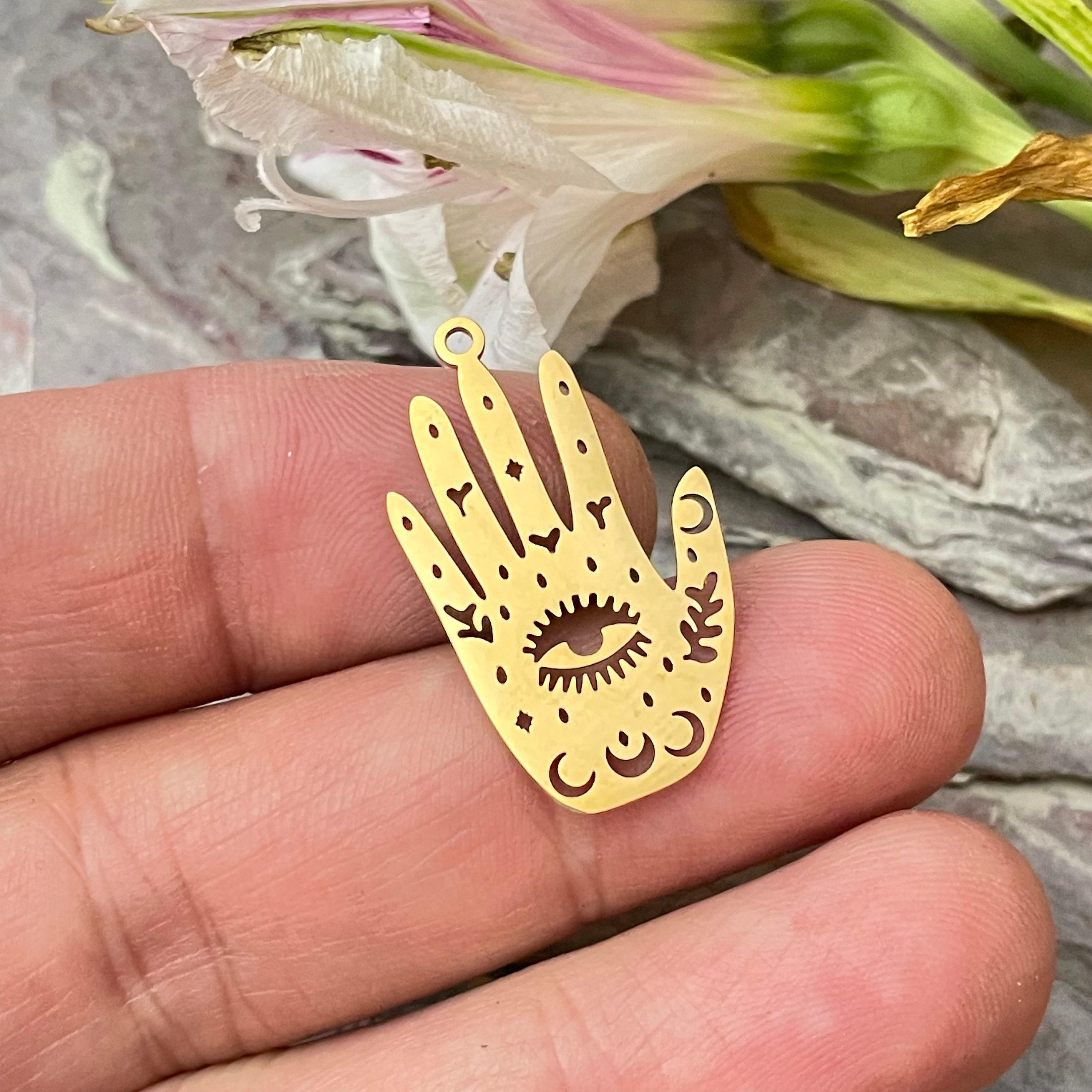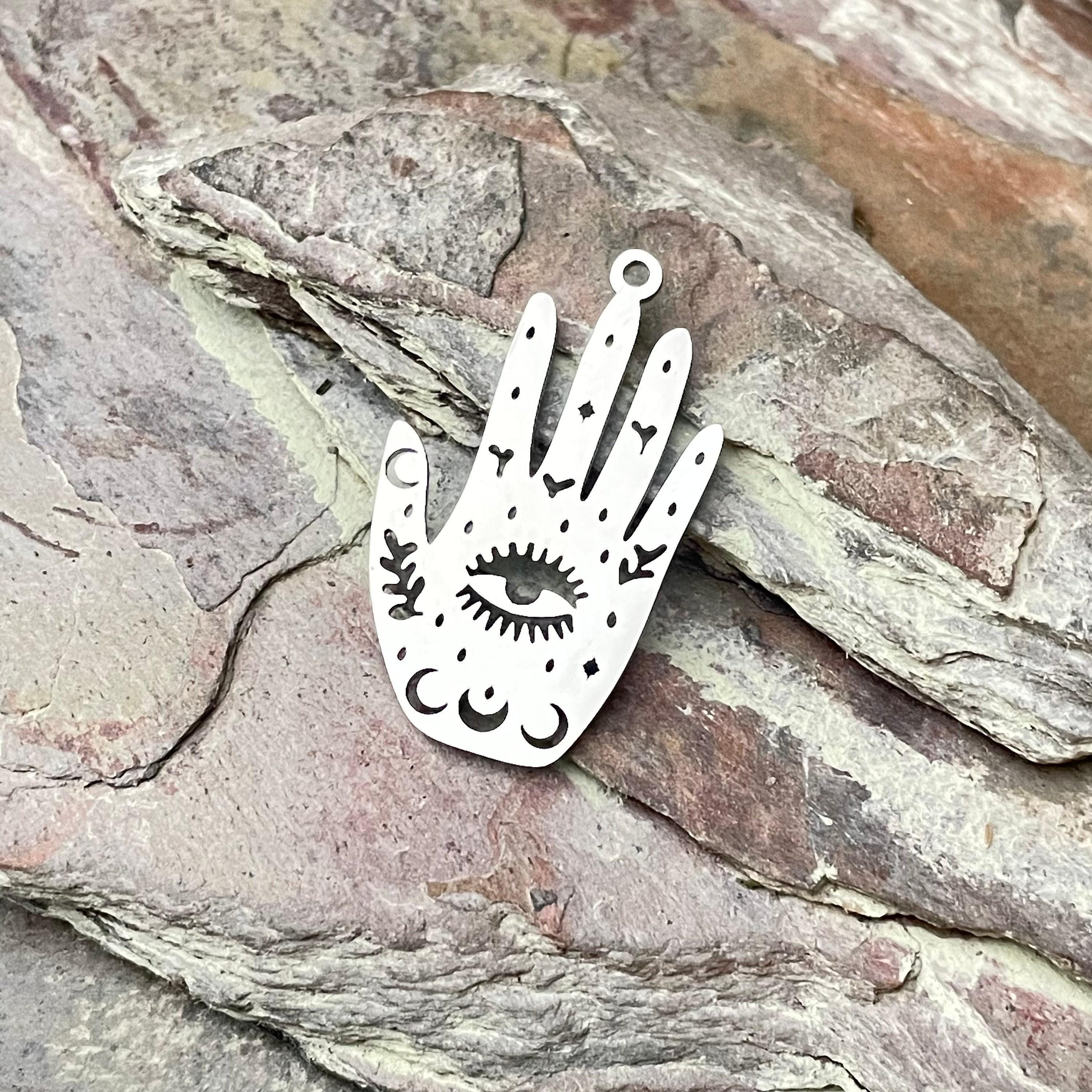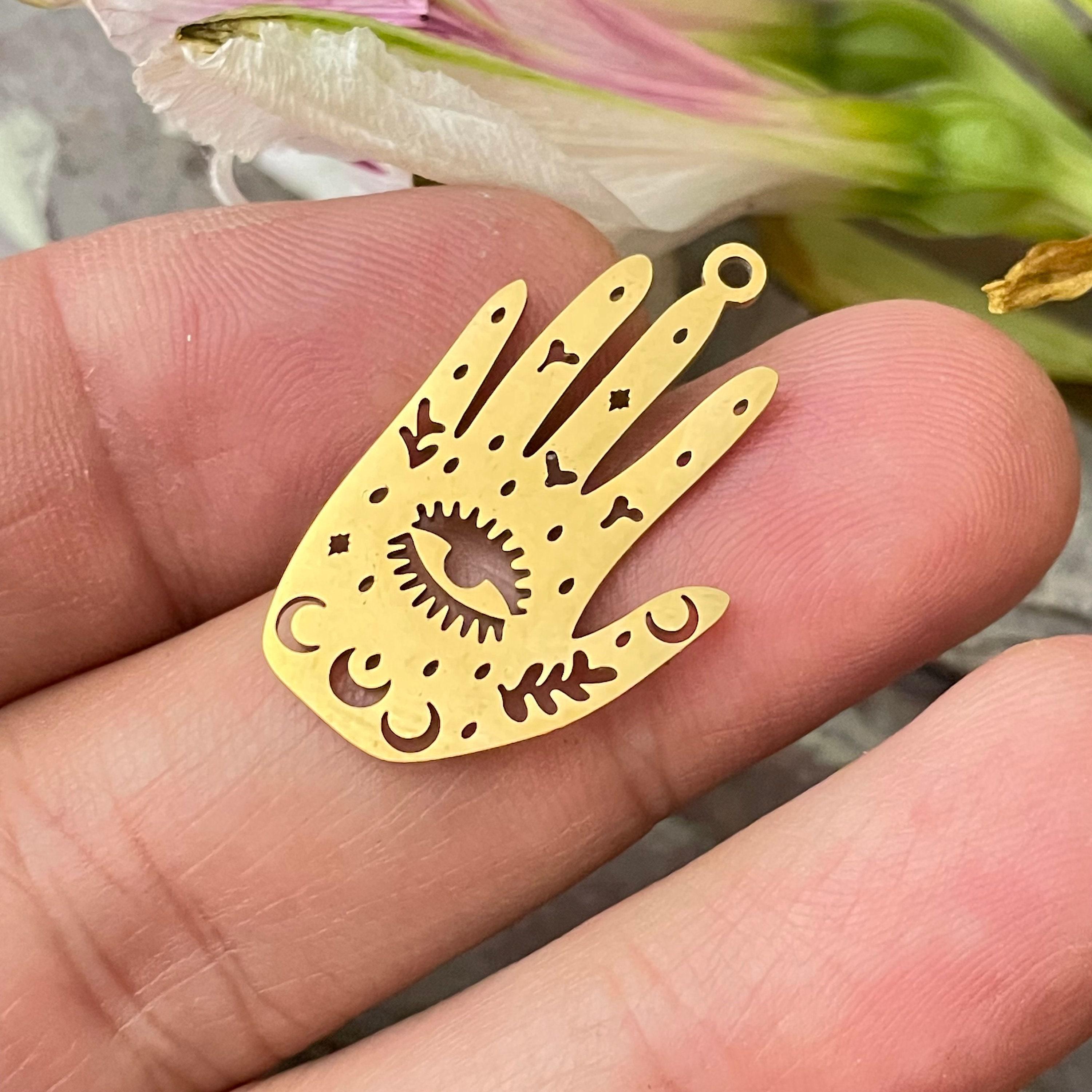 - Laser cut palm with eye design measuring approximately 1.18 inch (30mm) long, 0.71 inch (18mm) wide, and 0.04 inch (1mm) thick