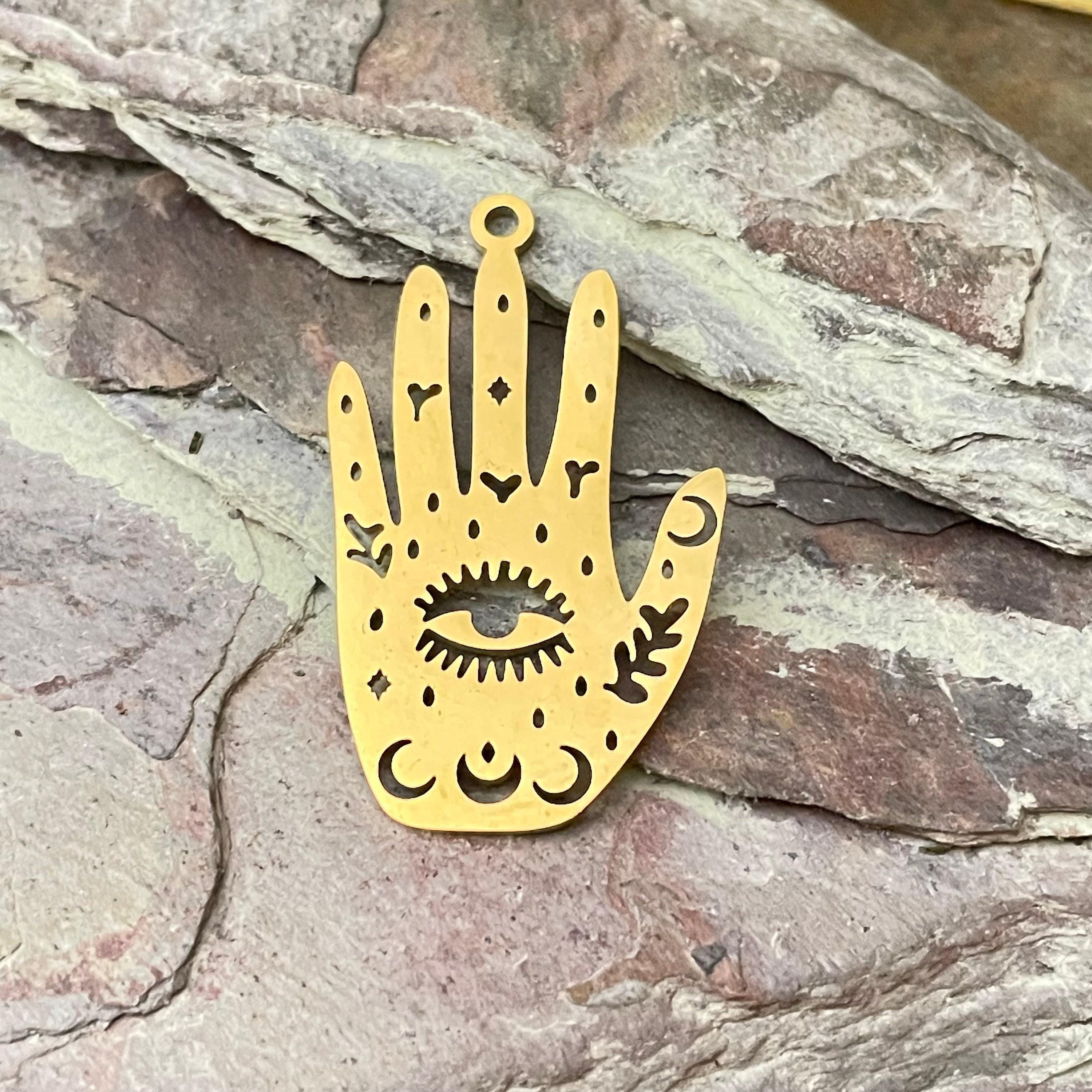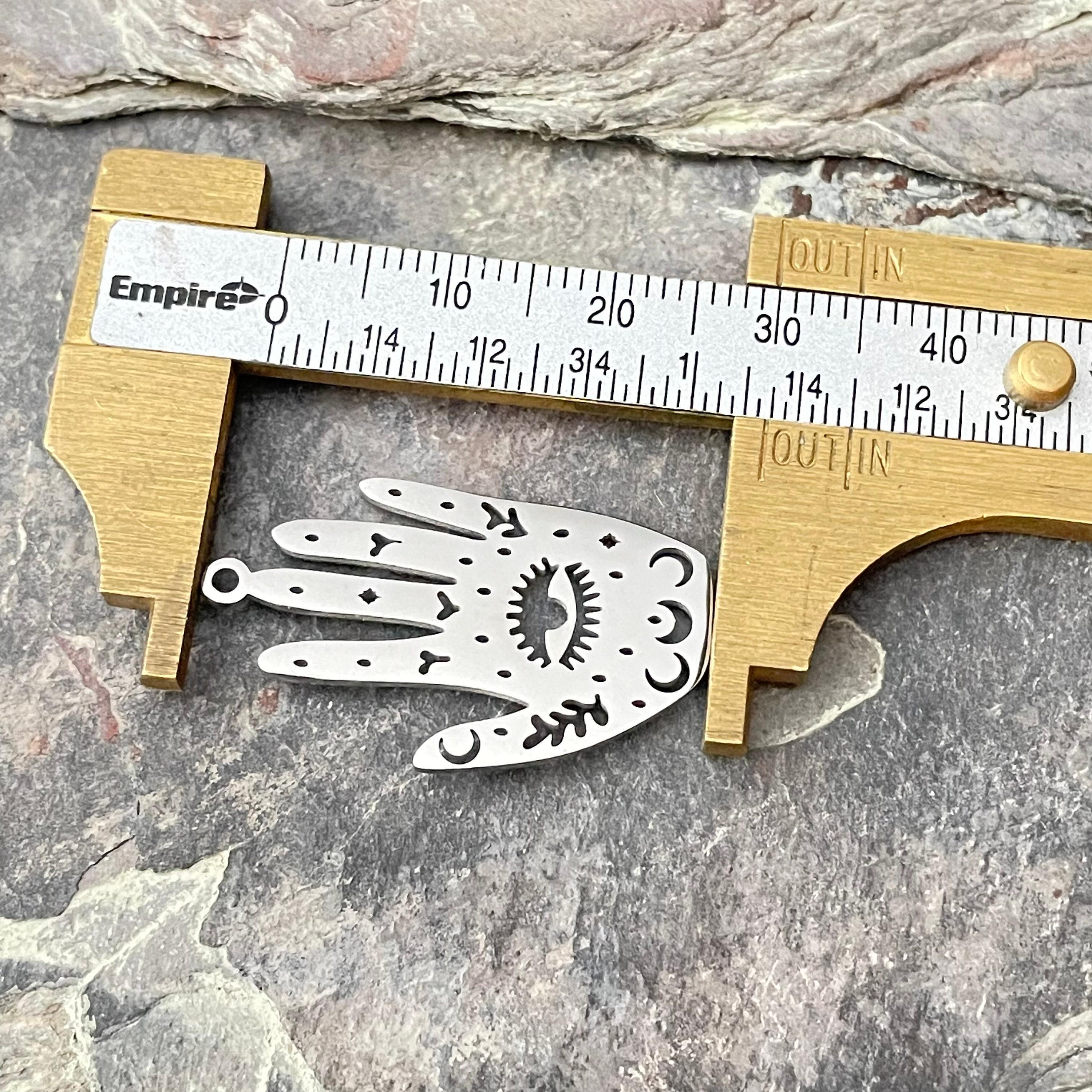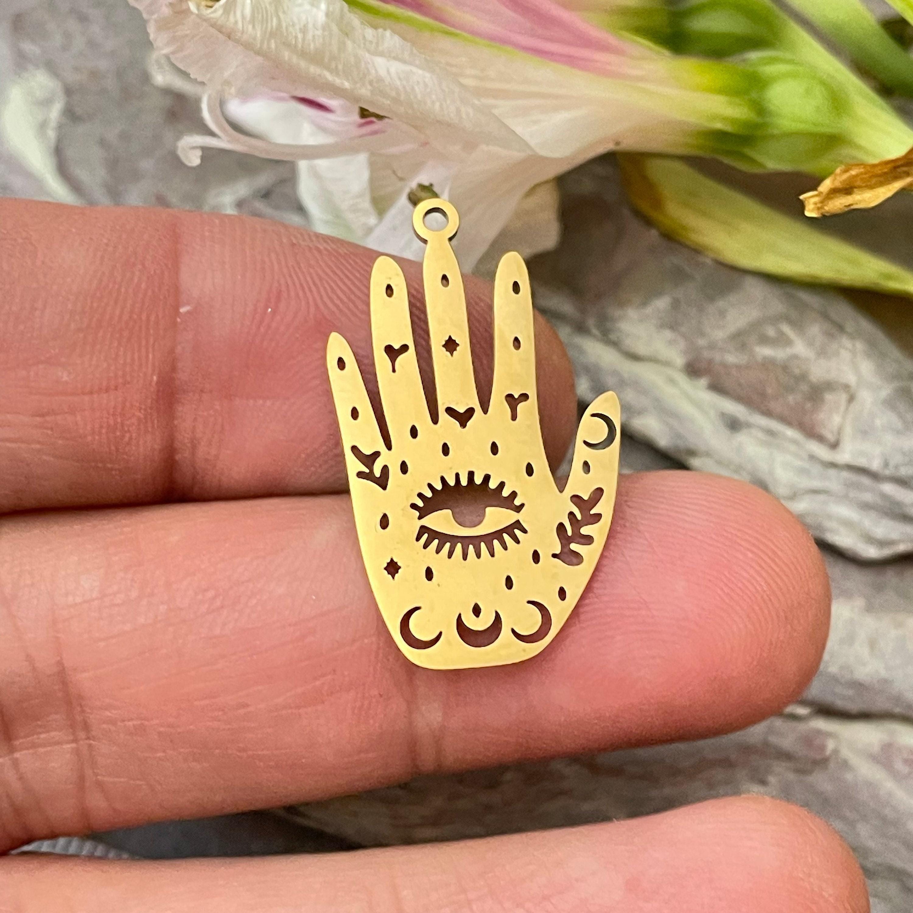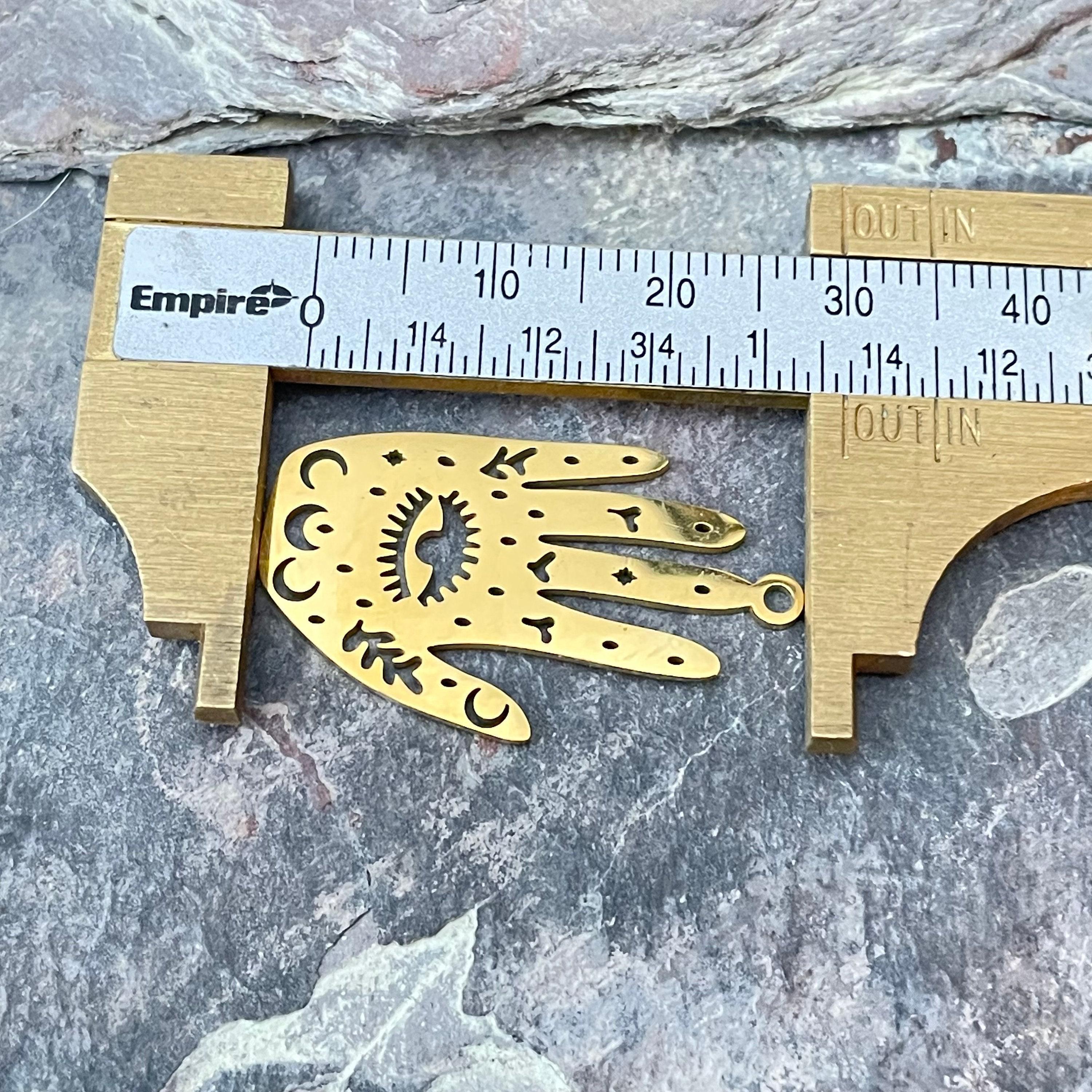 - Laser cut palm with eye design measuring approximately 1.18 inch (30mm) long, 0.71 inch (18mm) wide, and 0.04 inch (1mm) thick