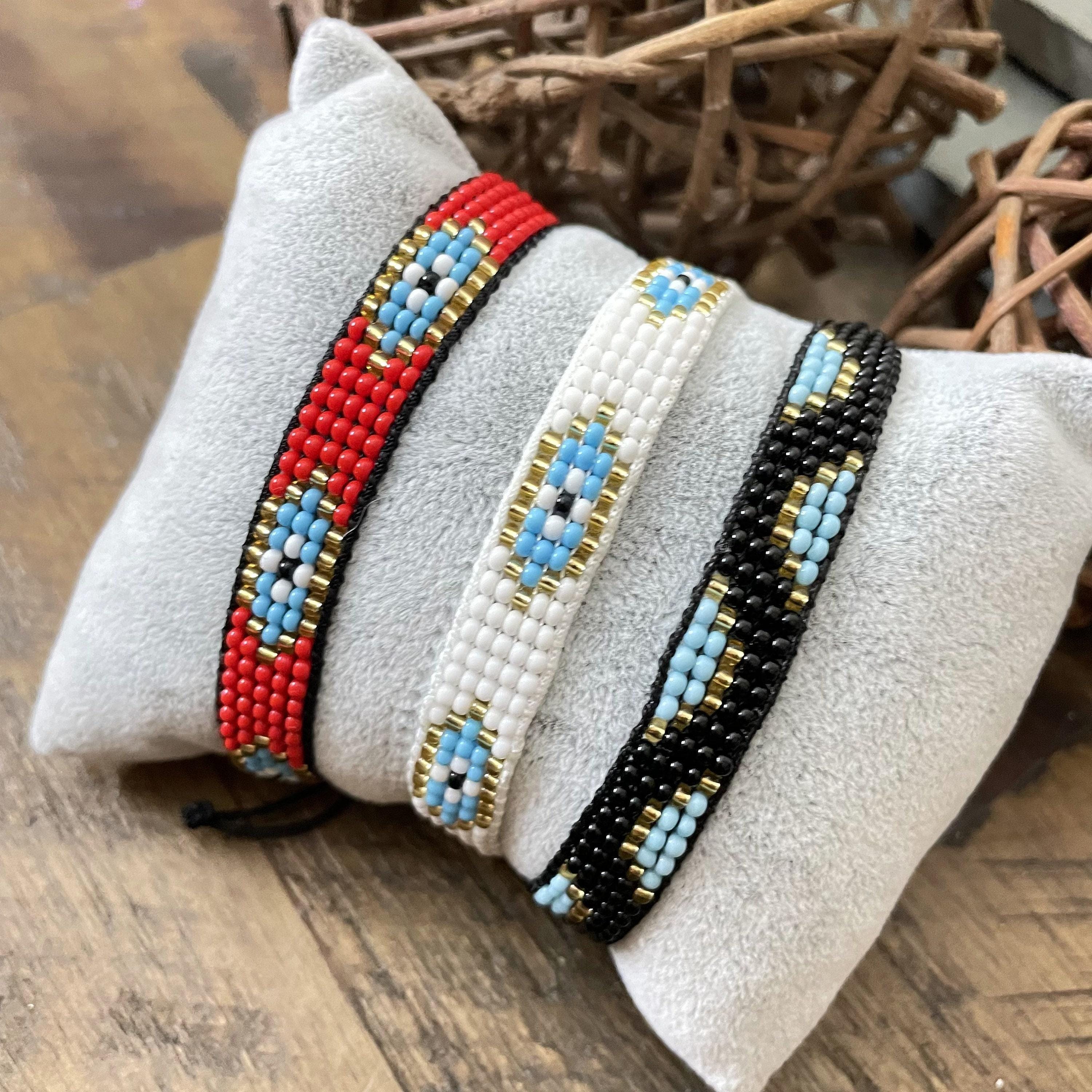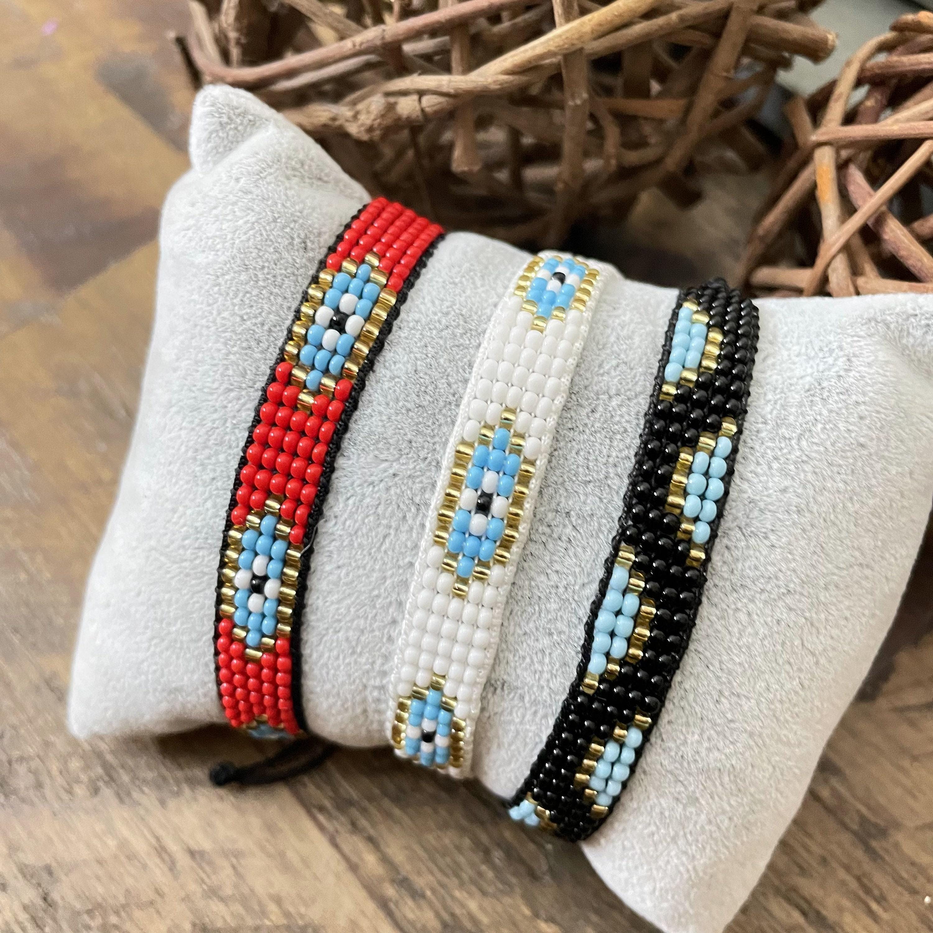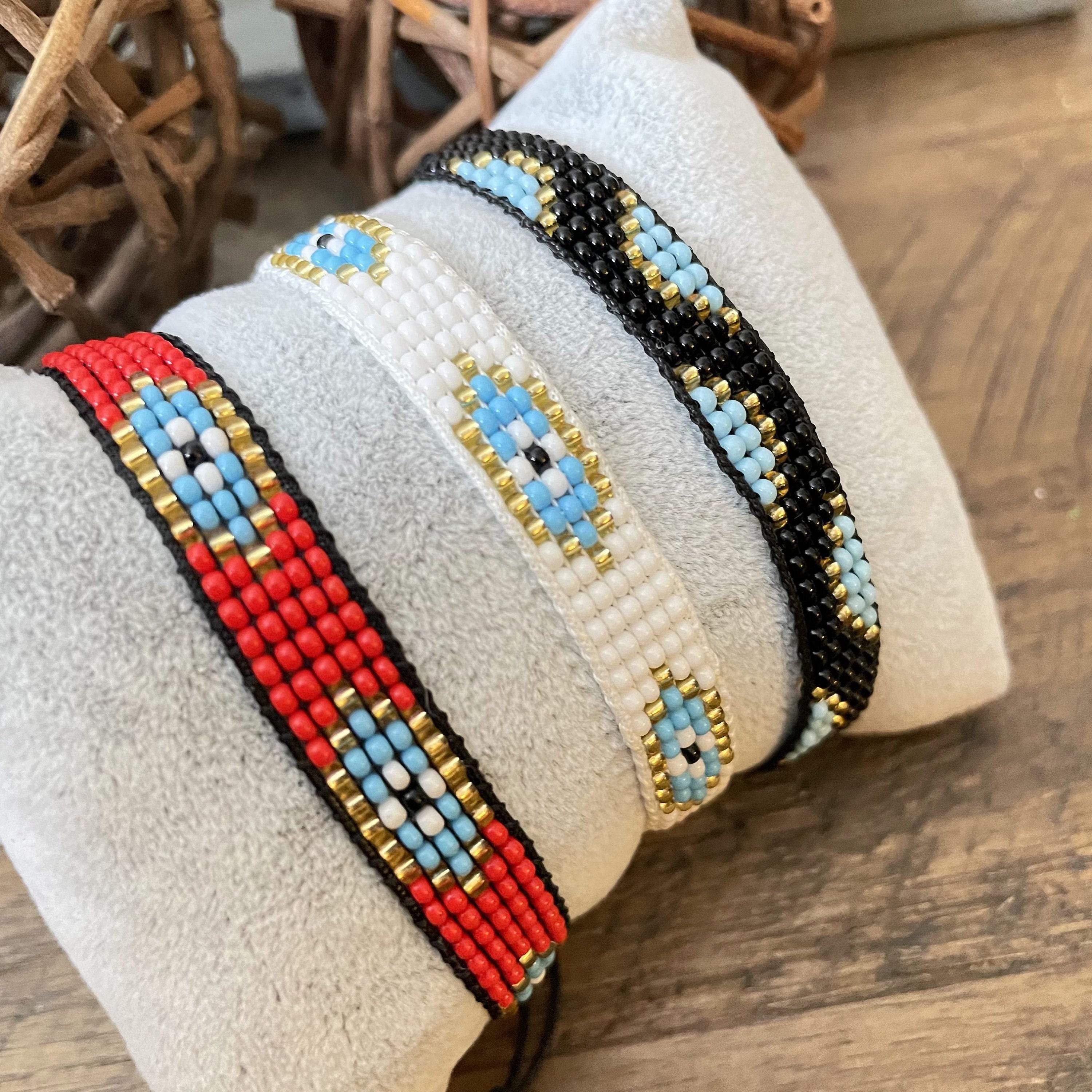 Discover the charm of handcrafted artistry with this exquisite set of woven bracelets, featuring delicate glass bead detailing and the protective symbolism of the evil eye. Each braided bracelet is meticulously made using Miyuki seed beads, blending tradition and style into a versatile accessory perfect for everyday wear. These adjustable knotted bracelets celebrate friendship and love, designed to complement any wrist with vibrant color energy.