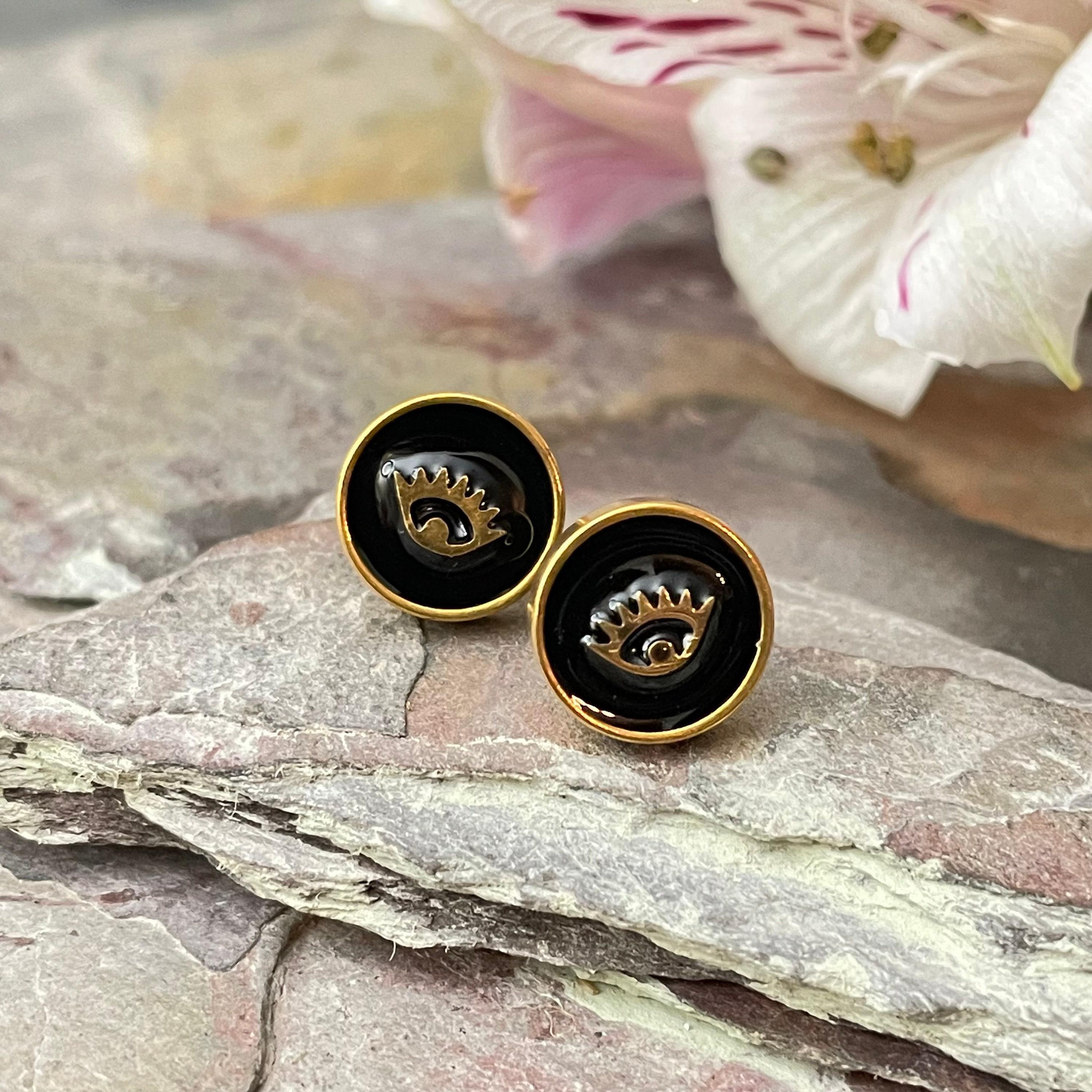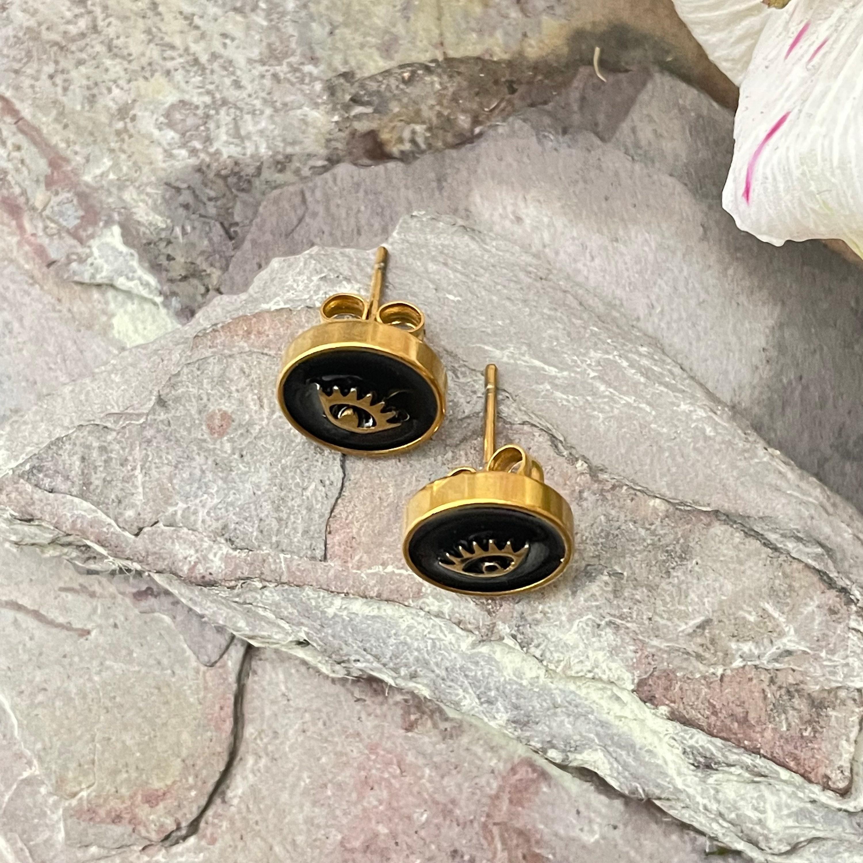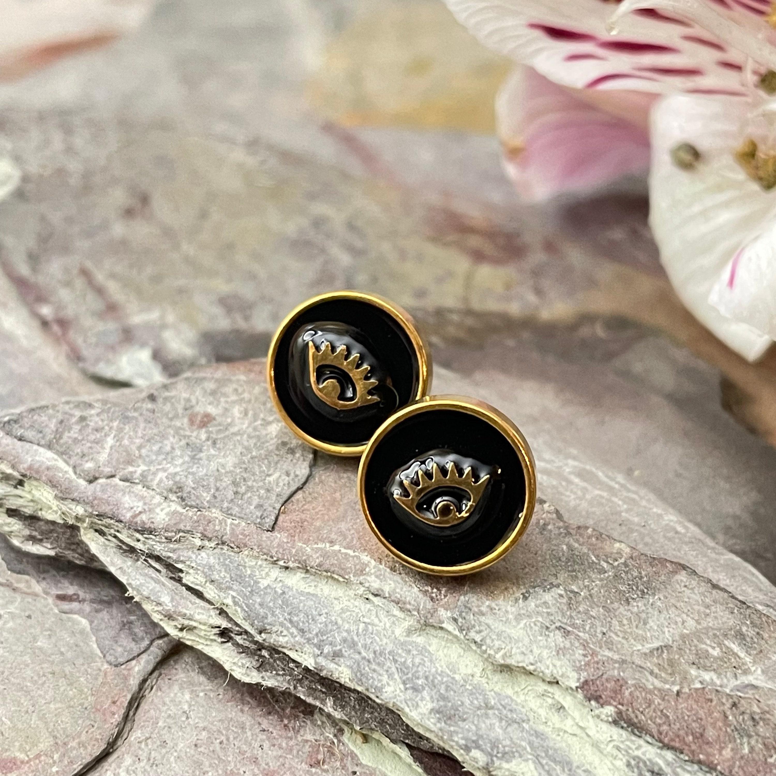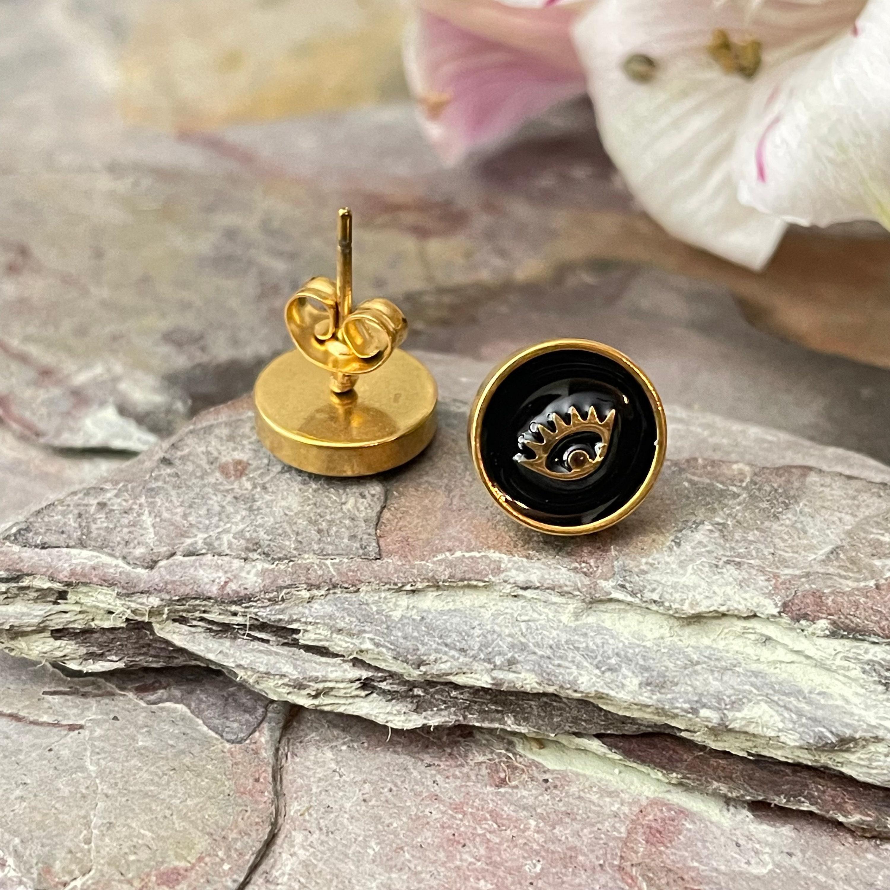 Embrace the allure of bohemian spirit with these exquisite gold stainless steel earrings, featuring a captivating eye motif that blends art deco influence with modern minimalism. Each pair is thoughtfully crafted with black enamel studs, designed to add a subtle yet meaningful touch to your everyday style or special moments. Perfect as an anniversary gift or a unique present for her, these flat round earrings celebrate individuality and timeless elegance.