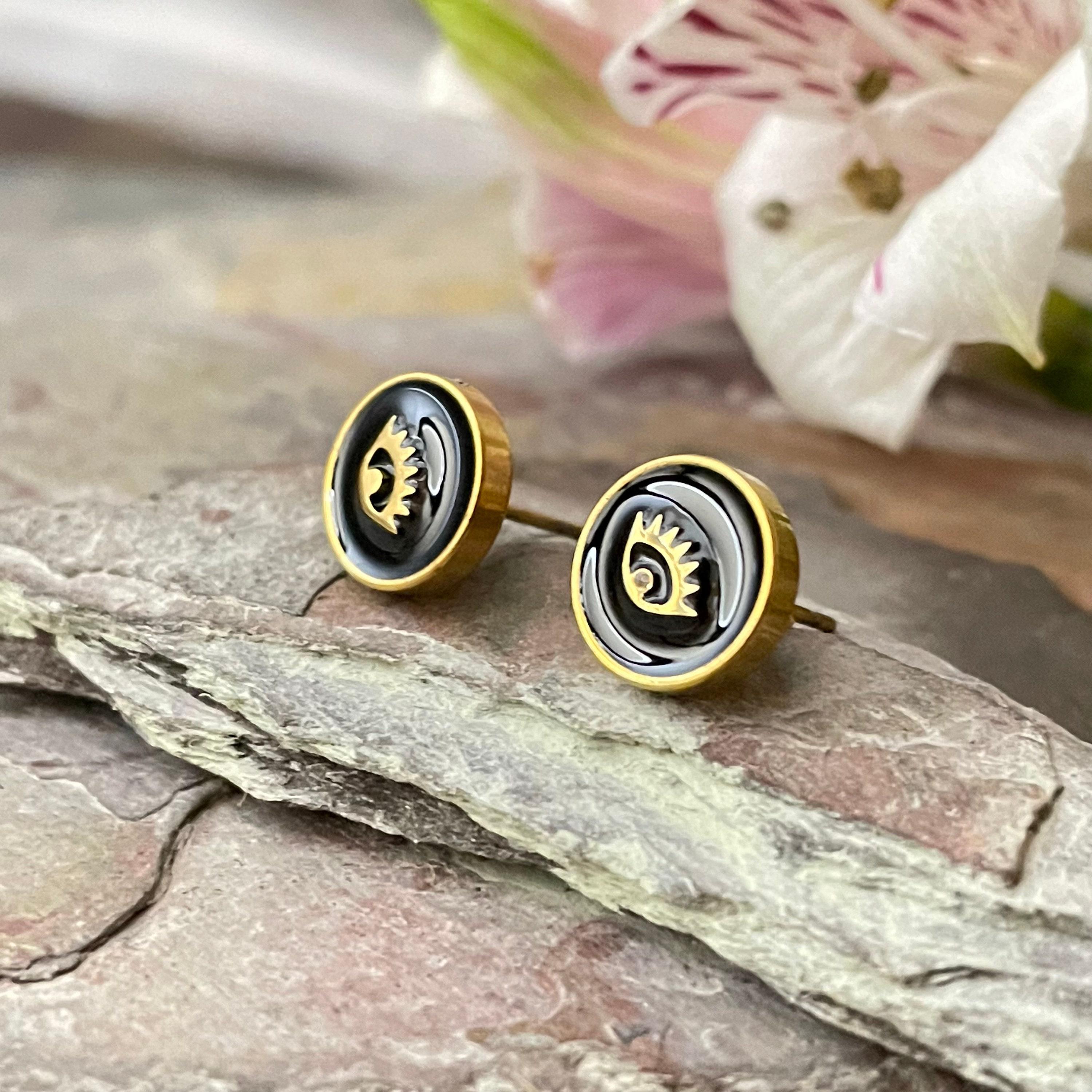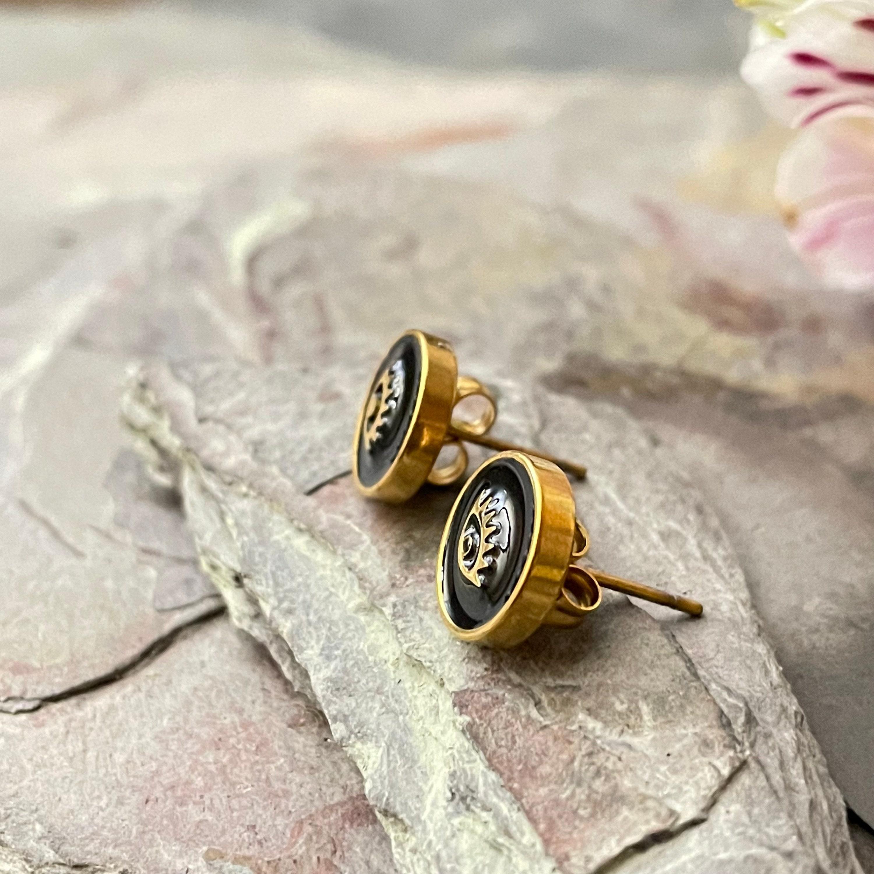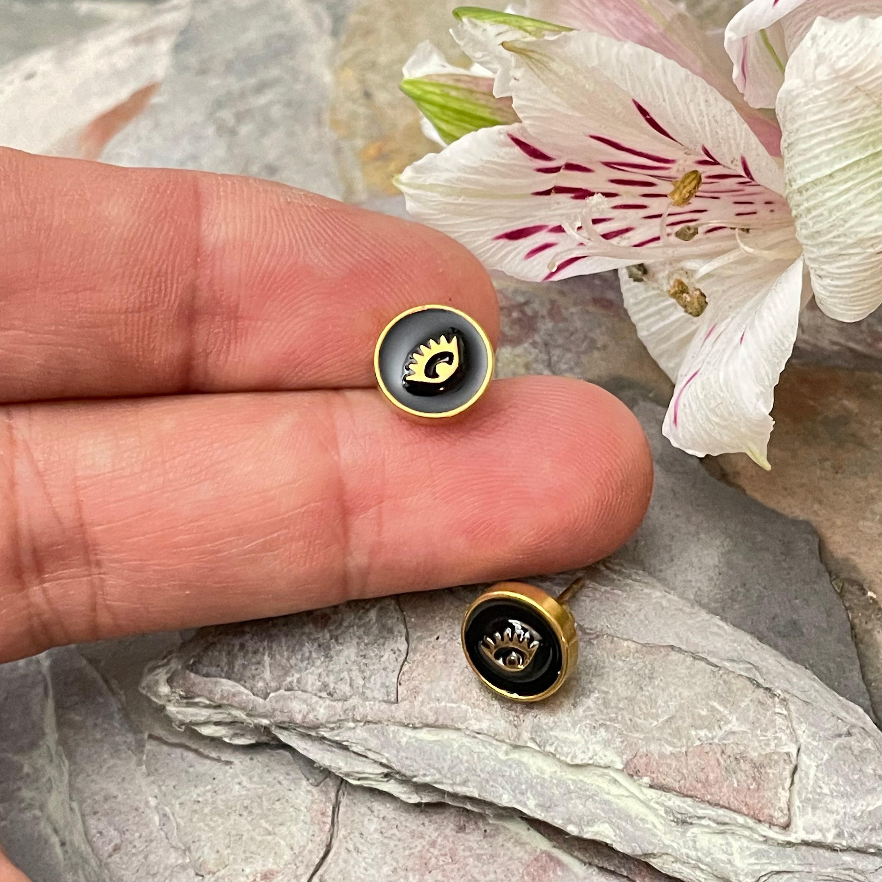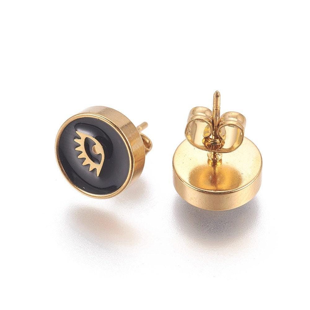 Embrace the allure of bohemian spirit with these exquisite gold stainless steel earrings, featuring a captivating eye motif that blends art deco influence with modern minimalism. Each pair is thoughtfully crafted with black enamel studs, designed to add a subtle yet meaningful touch to your everyday style or special moments. Perfect as an anniversary gift or a unique present for her, these flat round earrings celebrate individuality and timeless elegance.